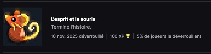 Caravan SandWitch Caravan SandWitchEvaluation : Bien aimé Preuve : https://s1.directupload.eu/images/251126/g9gqpp3q.jpg Commentaire : C'est un jeu d'exploration en 3D sur une planète nommée Cigalo, qui a des coins qui ressemble pas mal aux calanques de Marseille Terminé le : 26/11/2025 The Spirit and the MouseEvaluation : Bien aimé Preuve : https://s1.directupload.eu/images/251116/sky5cjro.jpg Commentaire : C'est un petit jeu d'aventure / exploration tout mignon dans une ville française fictive (nommée Sainte Éclair), dans lequel on incarne une petite souris qui va aider les habitants de cette ville sans qu'ils le sachent. C'est vraiment bien, j'ai été agréablement surpris et je suis content de ne pas l'avoir skip pour l'Event. C'est très mignon, y a de l'humour, c'est totalement "wholesome" et très varié niveau gameplay. Les personnages sont très sympa, et c'est rare d'incarner une souris muette si sympathique. Pas mal de moments mignons dans le jeu, et la fin est très jolie. C'est très centré sur l'électricité, et les pouvoirs de la souris sont assez sympa à utiliser. Les musiques sont très sympa, avec des petits airs d'accordéon à la française, d'ailleurs l'ambiance m'a pas mal rappelé Ratatouille Terminé le : 16/11/2025 Pumpkin JackEvaluation : Bien aimé Preuve : https://s1.directupload.eu/images/251105/tfw3e4nk.jpg Commentaire : Petit plateformer / action sans prétention, assez joli (y a même du Ray Tracing Terminé le : 05/11/2025 SOMAEvaluation : Bien aimé Preuve : https://s1.directupload.eu/images/251113/tr8qwkrj.png Commentaire : On joue Simon, qui a eu un accident de voiture il y a quelques mois, et a le cerveau endommagé suite à cet événement. Il participe à un programme de scan et de réparation du cerveau qui semble un peu suspect au premier abord... et se retrouve dans une station sous-marine environ 100 ans plus tard. Il va devoir découvrir ce qui lui est arrivé en enquêtant sur la station et ses... habitants. Terminé le : 13/11/2025 ObservationEvaluation : Moyennement aimé Preuve : https://s1.directupload.eu/images/251120/49f2bjte.jpg Commentaire : Un jeu narratif / "camera simulator" avec des puzzles dans une station spatiale, plutôt sympa et intriguant au début, mais qui s'essouffle un peu trop vite. Le gameplay à base de caméras qui mettent 3 plombes à tourner devient vite répétitif, et les situations ne sont pas assez variées pour relancer l'intérêt du jeu. Ça m'a pas mal fait penser à Experience 112, pour ceux qui connaissent, mais on est à des années-lumières (pun intended) de ce dernier en terme d'intérêt. Dommage, car le scénario peut presque tenir en haleine (je dis presque, car il s'écroule complètement vers la fin, et n'a plus aucun sens). Peu de budget, et un jeu qui ne va malheureusement pas au bout de ses idées. Terminé le : 20/11/2025 |